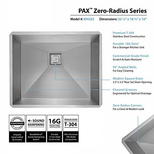 Kraus KHU23 Pax Zero-Radius 22 1/2" 16 Gauge Handmade Undermount Single Bowl Stainless Steel Kitchen Sink
