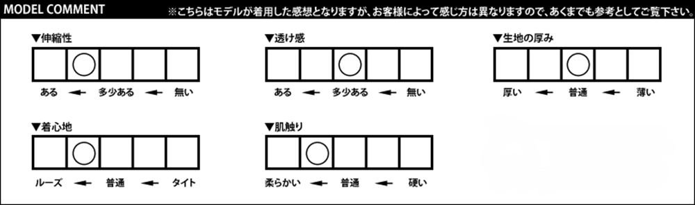 [Stretch ... There is somewhat] [Sense of sheer ... somewhat] [Thickness of the fabric ... normal] [Comfortable ... Somewhat loose] [Touch ... slightly softer]