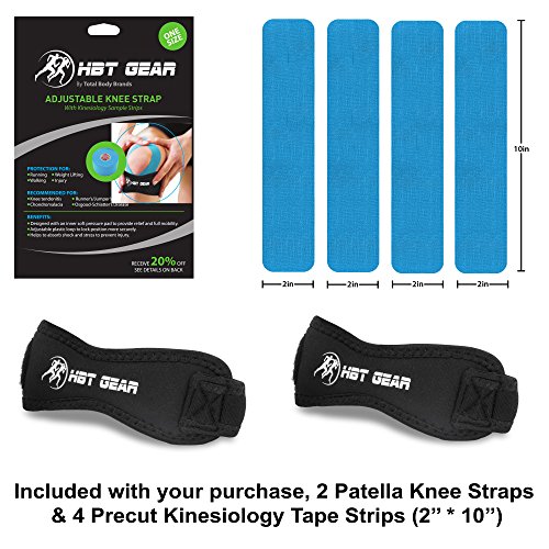 [FREE BONUS & DISCOUNT] - Included with your purchase: 4 Kinesiology PreCut Sample Strips, w/instructions (2 inches by 10 inches) for FREE to wear with our pair of HBT Gear Patella Knee Straps (both right and left knee). Get 15% off when you buy 2 or more - use code SAVKNEE2