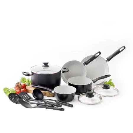 -. Feature : Includes: 1 qt saucepan, 2 qt saucepan, 5 qt stockpot, 9.5" open frypan, 8" open frypan, nylon ladle, nylon slotted spatula, nylon skimmer and nylon fish spatula / Healthy ceramic non-stick coating / Manufactured without PFOA / Easy-cleaning surface; Dishwasher safe / Oven-safe up to 350 degrees Fahrenheit