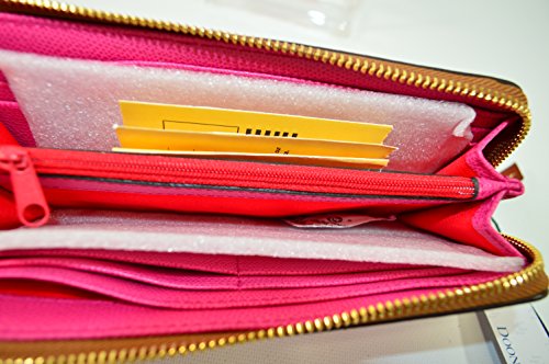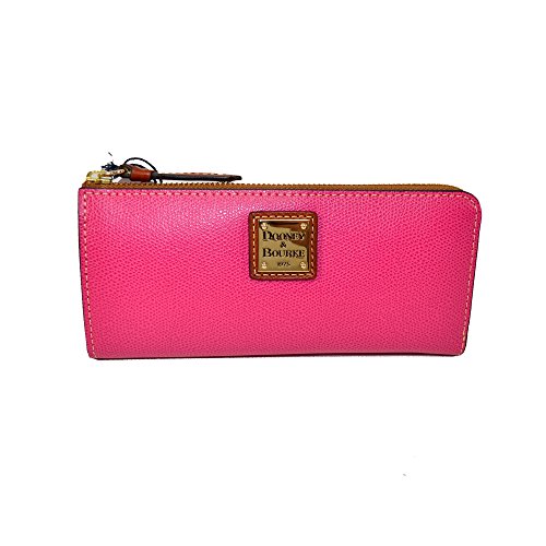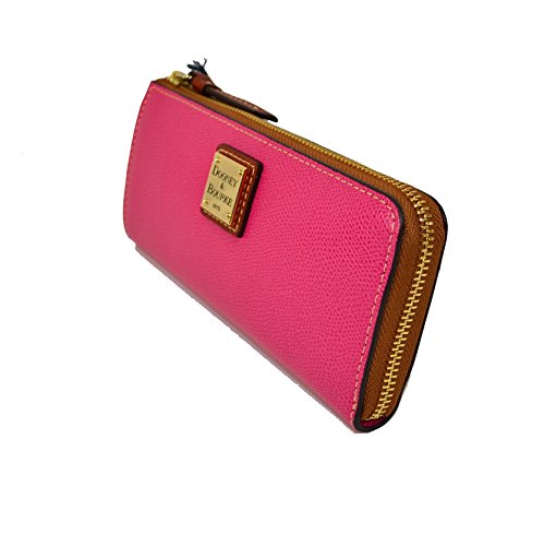 Product DescriptionDooney Bourke Embossed Leather Zip Clutch Fuchsia Natural brown leather trim. Lined. 8 c.card spaces, bill spaces,zip pockets inside. 3/4 zip around closure0