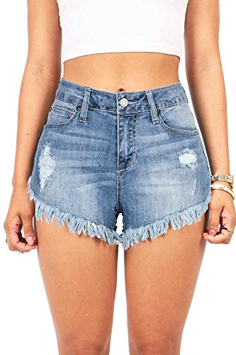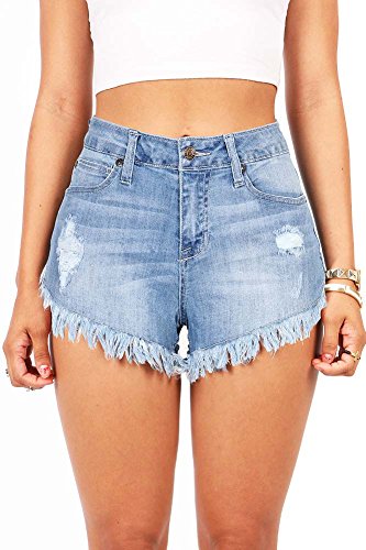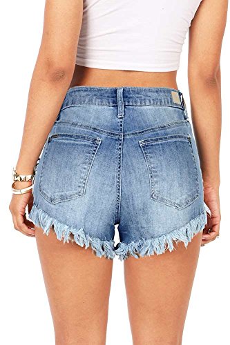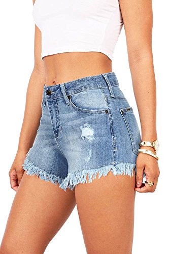 Mid rise denim shorts with fraying along the bottom edges. Distressing on the front with a lightly faded wash. Traditional 5 pockets with a button and zip fly closure. Perfect for any casual day out and pairs well with fitted or flowy tops.Feature