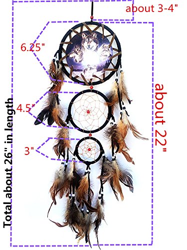 Size (Please see additional picture): about 22" from the top ring to the bottom feathers; the hanging string is about 3-4" ; Total about 26" in length.