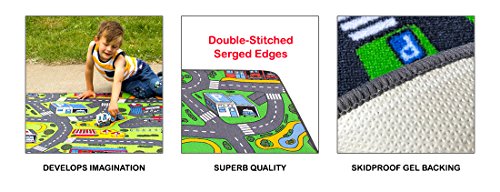 A hospital, fire station, post office and more are part of this city-themed children's rug, featuring numerous roads that travel through this fun, playful place. Ideal for use with your child's own toy cars, trucks and more, the rug is durable enough for both indoor and outdoor use. Unlimited Warranty. Soil and Stain Resistant Washable Carpet. Durable Latex Gel Skid-Proof Backing. 100% Nylon Carpet. Meets All ASTM F963 Safety Standards. Indoor/Outdoor Usage. Able to Withstand Rugged Wear. Highest Inflammability Rating in the industry. Award-Winning. 39 in. W x 79 in. L (5 lbs.). This self-contained metropolis has it all: school, hospital, fire and police stations, a park, church, service station, parking garage, bus stop, restauranteven its own airport! Hours of fun can be had without ever leaving the border of this city-themed carpet.Feature