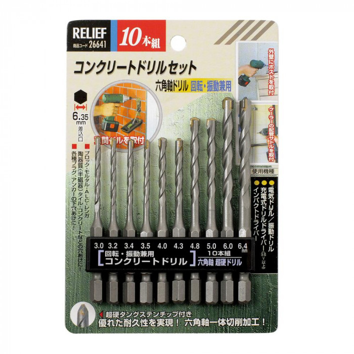 fk094igrjs優れた耐久性六角軸一体切削加工超硬タングステンチップ付 サイズ 個装サイズ:15×7×3cm 重量 個装重量:19g 仕様 10本組 コンクリート、ブロック、レンガ用 六角軸ドリル回転・振動兼用(差込口:6.35mm) 超硬タングステンチップ付 【使用可能機種】 電気ドリル 振動ドリル 充電式ドリルドライバー(9.6V以上) インパクトドライバー 製造国 中国 コンクリート、ブロック、レンガなどの穴あけに 優れた耐久性六角軸一体切削加工超硬タングステンチップ付