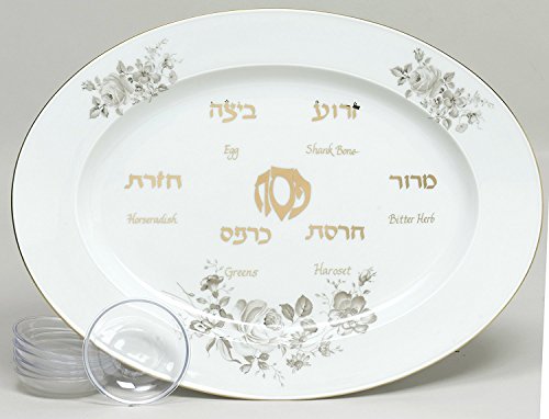 Oval Passover Seder Plate With Floral Design, White and Gold, Includes Liners