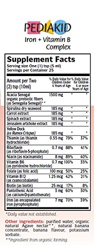 Pediakid Iron + Vitamin B Complex is an excellent source of organic proteins and anti-oxidants rich in extra-natural fibers of Carrot, Artichoke, Spinach and complex vitamin B1 to B12 to complement the school and home nutrition.
