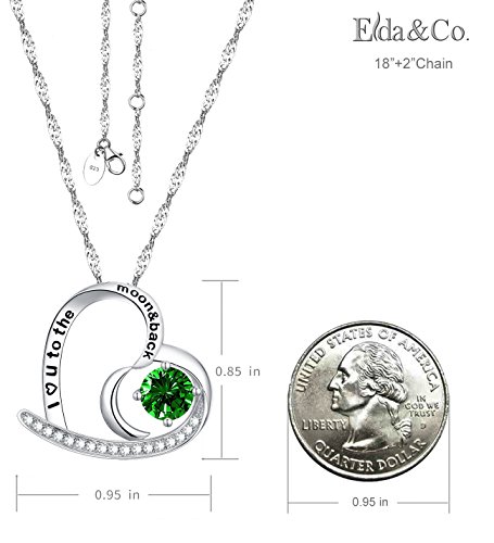 superior quality, 18K white gold plated over sterling silver, this delicate Green Emerald May Birthstone Love Heart Moon Necklace and 20" Singpore chain will never let you down.
