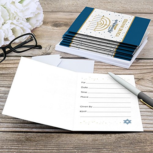 PREMIUM PARTY INVITATIONS: Happy Hanukkah - Chanukah party invitations are professionally printed on heavy-duty card stock paper with a photo-like shine. They are then hand-folded and individually inspected, then carefully packaged with our exclusive squiggle flap envelopes, making this Star of David themed stationary set a must-have for a Menorah party.
