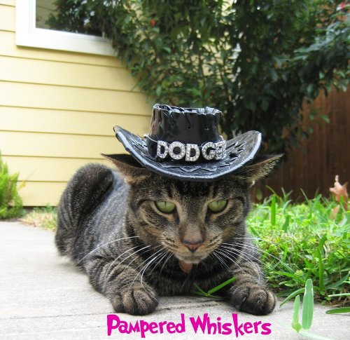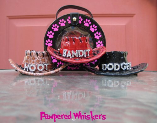 Studio : Pampered Whiskers Publisher : Pampered Whiskers Binding : Misc. Product Description Pampered Whiskers Personalized Cowboy hat is 4-6" diameter hand stitched from the finest leatherette, and lined with suede. Either before or after placing your order, either send us a message via Amazon, letting us know your pets name or team name that you would like on the hat, or we will contact you via Amazon messaging. A portion of the proceeds from Pampered Whiskers hats benefit a handful of organizations who are working to help animals who are not as fortunate as our own. 0