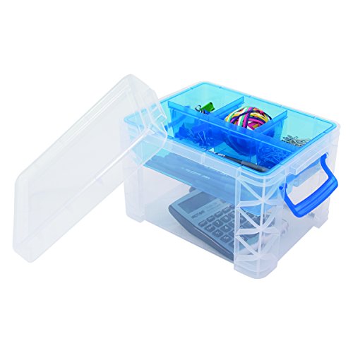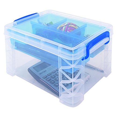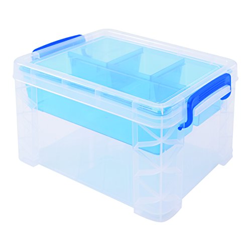 Super Stacker Divided Storage Box with Removable Tray, 10.12"x6.5"x7.5", Clear with Blue Handles, Snap Lid (37375)