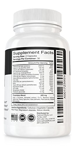 Ingredients include Biotin, Zinc, Magnesium, B Vitamins Saw Palmetto, Bamboo Extract, Spirulina, L-Tyrosine, Nettle Root Alfalfa and much more!