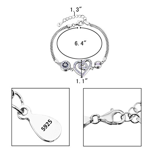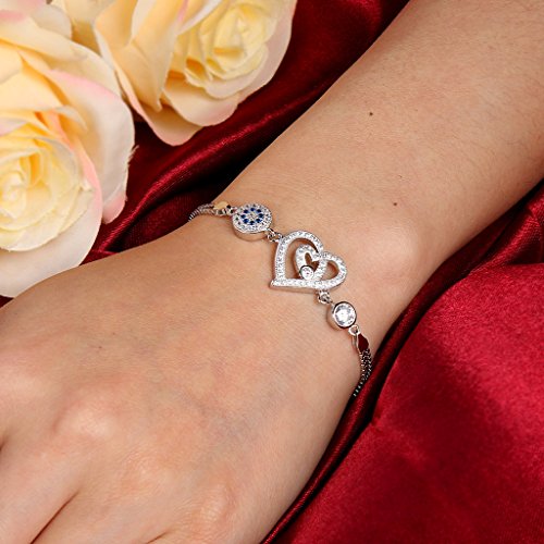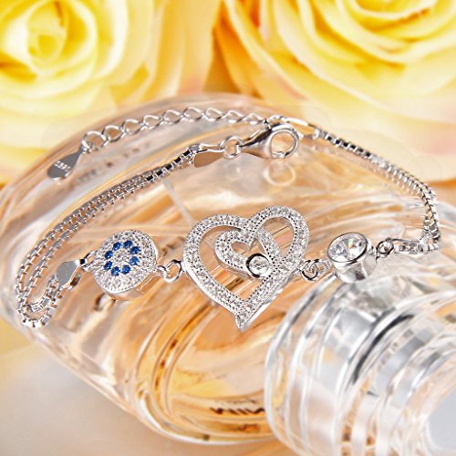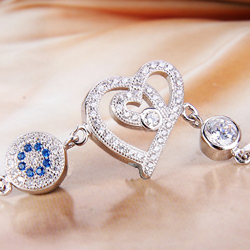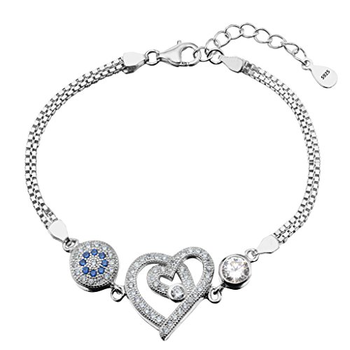 -. Title : EleQueen 925 Sterling Silver CZ Round Evil Eye Double Strand Heart in Heart Bracelet Chain Rhodium Plated