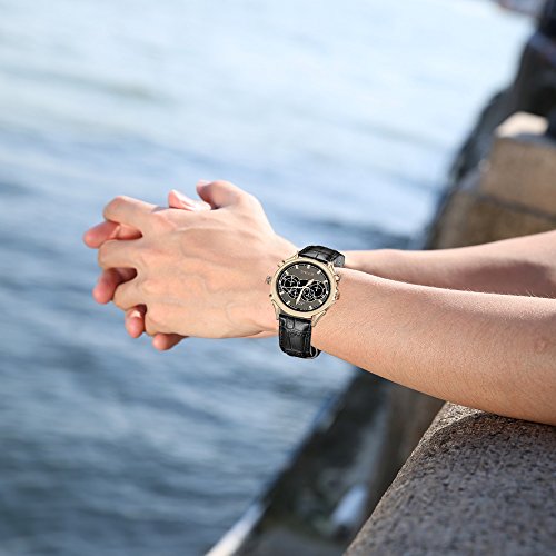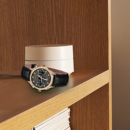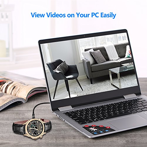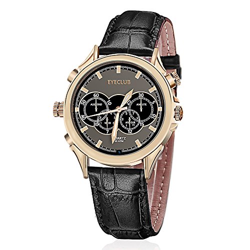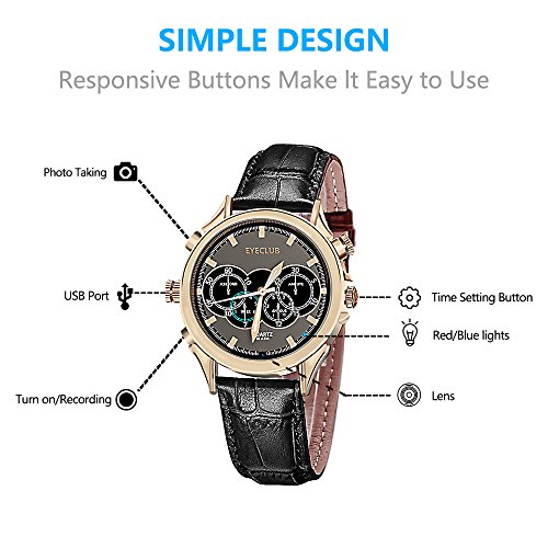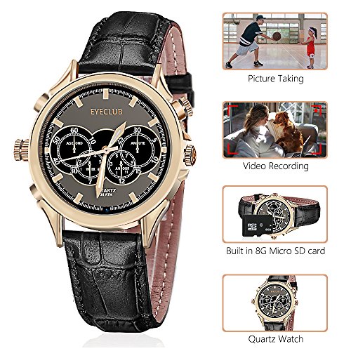 With golden films coated on the stainless steel case, elaborately designed dial, and matt black band, this hidden camera is stylish