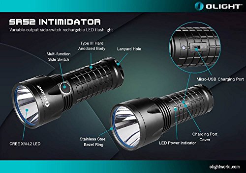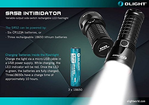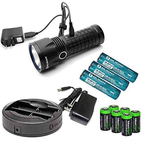 Olight SR52 Intimidator 1200 Lumen Cree XM-L2 LED USB rechargeable Flashlight, Olight Omni-Dok Universal Battery Charger, three Olight 18650 3400mAh Li-ion rechargeable batteries and six EdisonBright CR123A Lithium Batteries bundle