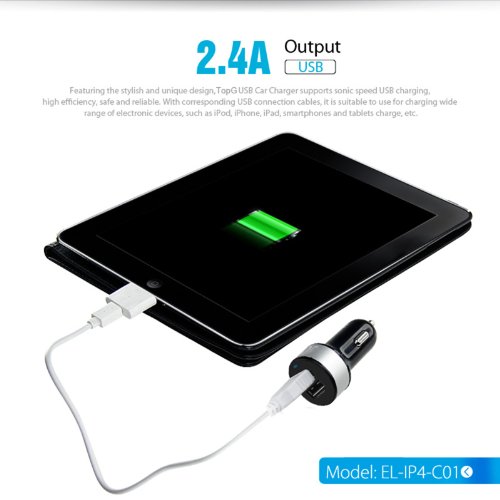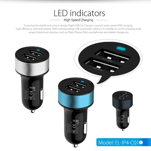 - Feature : The TopG Smart Mini Dual USB Universal Car Charger allows you to charge Smartphones, tablets, music players, and electronic devices on the trip, MFI(Made for iPhone iPad iPod)Approved, optimal performance on all Apple product,cable is not included. / Both USB ports(2.1A and 1A)offers rapidly charging of smartphones, tablets, and other devices. For iPad or Tablet optimal recommend to use 2.1A port. Smart charge at maximum speed limited by devices or USB ports, automatically stops when the device battery is full. A blue LED power indicator is lit to show that car charger is ready for use or is charging. / Input Voltage: DC 10.5 V-18 V (12 V-18 V Battery), Direct Cigarette Lighter Connection. Output: Min 5.0 V Max 5.3 V, Full Rated 3.1 Amp (2.1 + 1 Amp USB Port) 15.5 W, Ripple & Noise Max 150 mVp-p. / CE, FCC & RoHS certificates. / Safely protect devices and charger from overheated. LED only light up when charger in good working condition: input voltage is in working range 10.5V-18V, automatically stops working when over current or over voltage is detected, switch to minimal charging current when battery is full. With the high charging efficiency of over 85%, the charger itself never get hot. High quality fire proof material & anti-oxidation aluminum pull tab. No radio loss in your car or effect to Bluetooth or Wi-Fi devices.