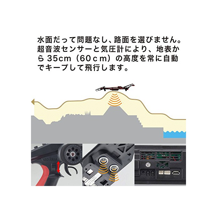3축각 속도 센서,3축 가속도 센서,초음파 고도 센서,기압계를 탑재.이러한 센서 정보를,쿄쇼의 라디오 콘트롤 레이스의 노하우에 튜닝 했 독자적인 알고리즘에 프로 포의 휠 조작 에 따라 롤과 요를 최적으로 믹싱.스틱 프로 포에서는 까다로운 선회도 드로(draw)《레사》에서는 간단.