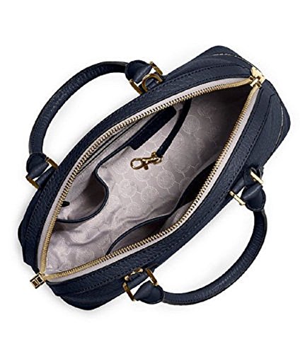 -. Brand : -. ClothingSize : OS -. Color : NAVY/GOLD -. Department : womens -. EAN : 0889154338166 -. Feature : 11" W x 9" H x 4" D / Interior features 1 zip pocket, 4 slip pockets and key fob / Exterior features gold- or silver-tone hardware and hanging logo charm / Double handles with 4" drop; adjustable shoulder strap with 19"-22" drop / Top zip closure -. Label : -. Manufacturer : -. ProductGroup : Shoes -. ProductTypeName : HANDBAG -. Publisher : -. Size : OS -. Studio : -. Title : Smythe Large Dome Satchel NAVY/GOLD -. UPC : 889154338166