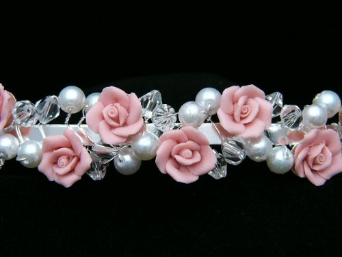Made with crystals beads, faux pearls and faux roses in silver plated setting