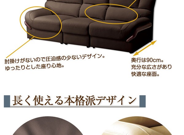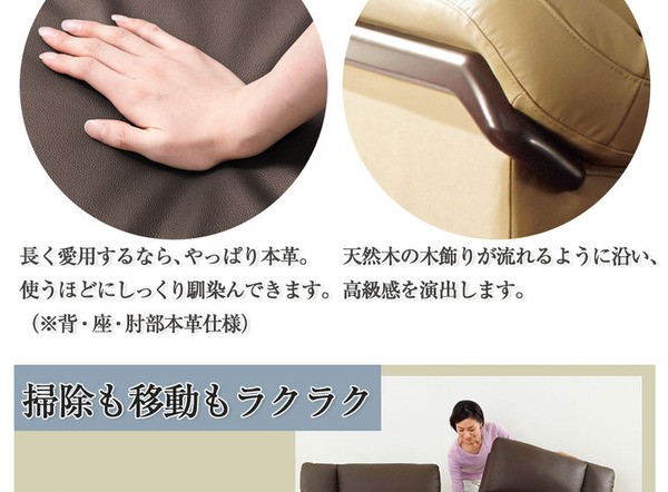 ■ 品質/張地:(背部・座面・肘部)本革、(その他)合成皮革、中材:木枠、S字バネ、ウェービングベルト、ウレタンフォーム、チップウレタン、肘掛装飾:天然木(ラッカー塗装)