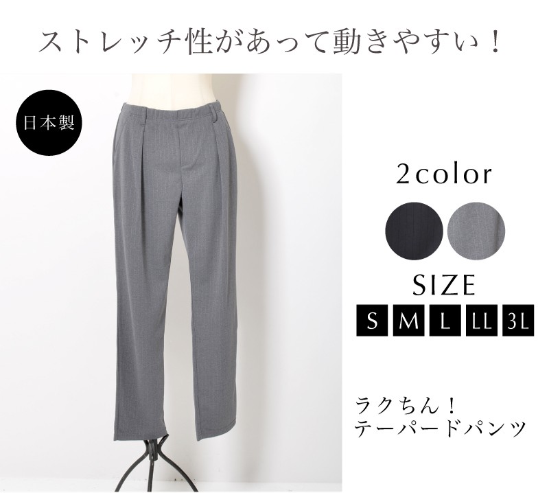 楽ちん!!ストレッチ性のある動きやすいテーパードパンツ♪生地そのもののストレッチ性とウエスト総ゴム仕様で快適な履き心地♪形状安定性とUVカット機能も備えているので、シワを気にせずきれいなラインをキープ。アクティブなシーンにもおすすめできるくらいラクラクです♪
