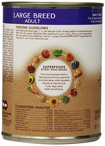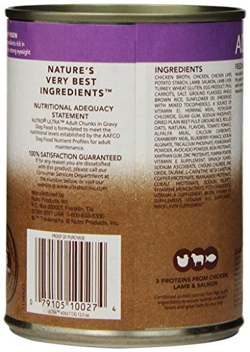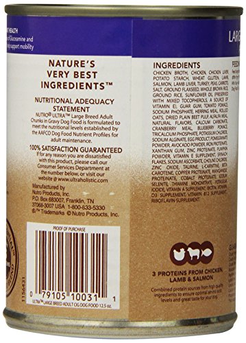 -. Binding : Misc. -. Brand : Nutro -. Feature : A unique blend of superfoods to support your dog's overall well-being / Three animal proteins from chicken, lamb and salmon help promote lean muscle mass / Rich in essential fatty acids for a healthy skin and a shiny coat / Natural sources of glucosamine and chondroitin to help support mobility / Made in the USA -. Label : The Nutro Company -. Manufacturer : The Nutro Company -. MPN : 10076269 -. PackageQuantity : 1 -. PartNumber : 10076269 -. ProductGroup : Pet Products -. ProductTypeName : PET_SUPPLIES -. Publisher : The Nutro Company -. Studio : The Nutro Company -. Title : NUTRO ULTRA Wet Dog Food