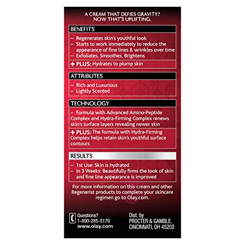 Olay skin scientists have formulated this anti-aging facial moisturizer with an advanced Amino-Peptide Complex to penetrate deep into the skin's surface to visibly reduce the appearance of wrinkles. Olay Regenerist Micro-Sculpting Cream, formulated with Hyaluronic Acid, Amino-Peptides and Vitamin B3, hydrates to lift, plump and firm skin. The luxurious-feeling moisturizer immediately leaves skin hydrated and softens the look of fine lines and wrinkles. It also firms the look of skin with plumping hydration. Dramatic transformation. Not drastic measures.Feature