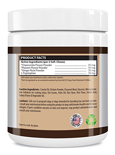 Per 2 Chews - Active Ingredients: Chamomile Flower Powder 50 mg, Passion Flower Powder 50 mg, Ginger Root Powder 30 mg, L-Tryptophan 30 mg. Inactive Ingredients: Canola Oil, Chicken Powder, Flaxseed Meal, Glycerin, Microcrystalline Cellulose (in coating only), Oat Groats, Palm Oil, Rice Bran, Rice Flour, Sorbic Acid, Turkey Flavor & Vegetable Oil.
