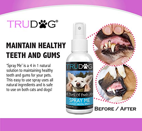 Spray Me is an all-natural and holistic dental spray made from essential oils which target tartar and bad breath at their source. TruDog Spray Me synergistically bonds with your pet's saliva to completely coat their entire mouth with only a couple sprays a day.