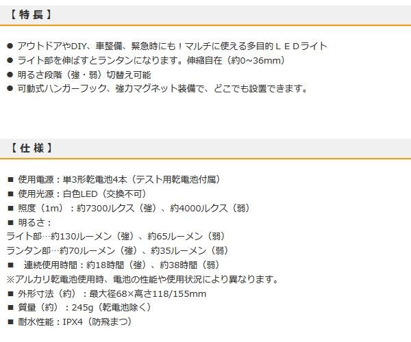 fk094igrjsさまざまなシーンでマルチに使えるLEDライトですライト部を伸ばしてランタンとしてもお使い頂けますサイズ個装サイズ:13×21×8cm重量個装重量:360g製造国中国DIYやアウトドア・緊急時など、マルチに使えるLEDライト!!さまざまなシーンでマルチに使えるLEDライトですライト部を伸ばしてランタンとしてもお使い頂けます