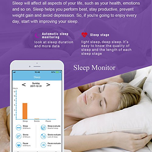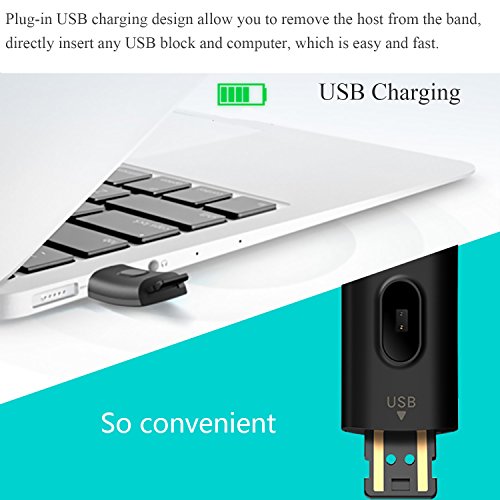 -. Feature : ★ Tracks real-time heart rate automatically & continuously to know your all-day heart rate; Automatically tracks your sleep duration & consistency with comprehensive analysis of sleep quality data. / ★ Accurately record all-day activities like steps, distance, calories burned, active minutes and sleep status, etc. Tracks your activity data wherever and whenever. / ★ See call SMS and SNS (Facebook, WhatsApp, LinkedIn, Instagram and Twitter) notification on your wrist to keep your phone out of sight and your goals in focus. / ★ Built-in USB port makes it easy to charge with any USB block and computer; no charging cable and dock needed. With one single charge for 3 hours, it gives you up to 7 days of working time. / ★ Supports smartphones with system version iOS 8.0 or above and Android 4.4 or above, bluetooth 4.0. Other functions: alarm alert, sedentary alert, mobile phone anti-lost, remote camera shooting.