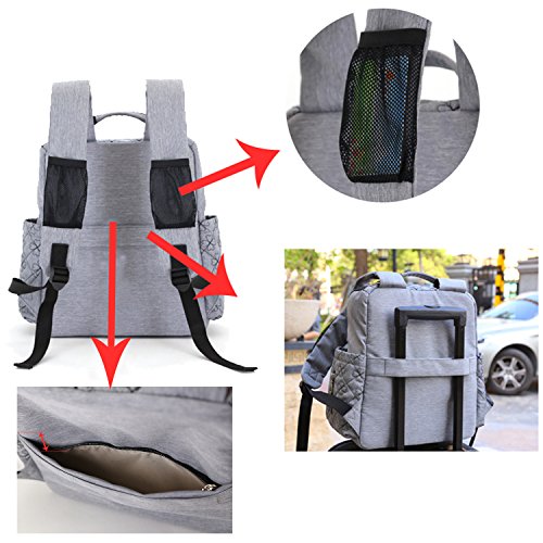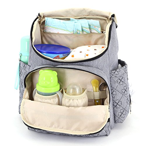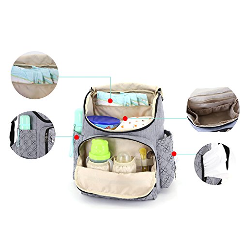 The backpack has large capacity with multiple pockets in both inside and outside. Accessories: a Diper Pad, 2 straps for strollers;