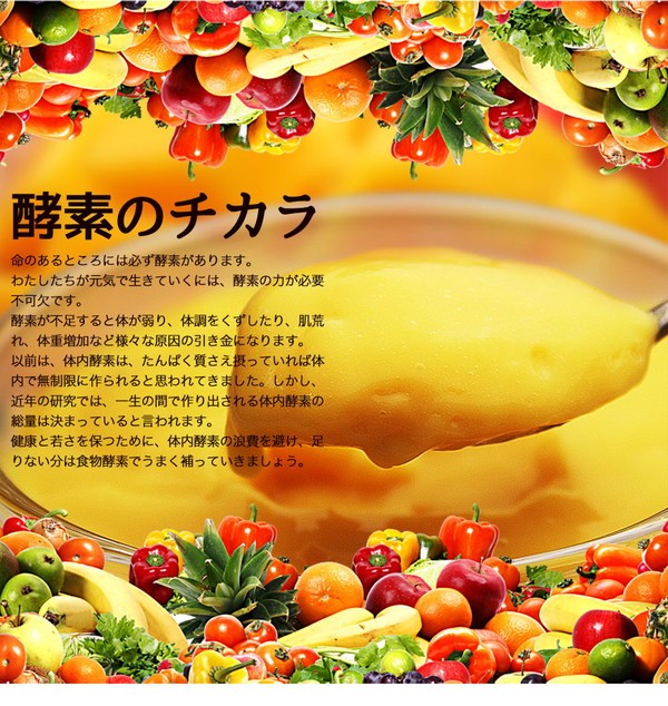 パイナップル:果糖ぶどう糖液糖、食物繊維(難消化性デキストリン)、パイナップル果汁、コラーゲンペプチド、植物発酵物乾燥粉末(デキストリン、黒糖、果物(オレンジ、パイナップル、バナナ、リンゴ、パパイア、グァバ、メロン、アボガド、アセロラ、ドライプルーン、レモン、洋梨、レーズン、マンゴー、すいか、スターフルーツ、キウイフルーツ、カムカム、アサイー)、野菜(しいたけ、カボチャ、さつまいも、トマト、にんじん、マンジョッカ、ピーマン、赤カブ、ヤーコン、大根、キャベツ、ゴボウ、コウベマンテイガ、チコリ)、野草エキス(パフィア、ローズマリー、カツアバ、紫イぺ、キャッツクロー、綿実、シナモン、レモングラス、カルケージャ、すぎな、シャペウ・デ・コウロ、アガリクス、アニス、マテ、ステビア、ウイキョウ、ショウガ、ガラナ、ハトムギ、パッションフルーツ、ムイラプアマ葉、パタ・デ・ヴァカ、ぺドラ・ウメ・カ、ピカオプレト、アマチャヅル、クローブ、ガジュツ、レンコン)、穀物(玄米、オーツ麦、とうもろこし、大麦、黒ごま、きび、ライ麦、ポップコーン(爆裂種))、豆類・ナッツ類(エンドウ豆、ブラジル豆、紫ブラジル豆、小豆、大豆、黒ブラジル豆、レンズ豆、ひよこ豆、カシューナッツ、パラナッツ)、海藻類(わかめ、昆布、海苔)、ハチミツ)、ゲル化剤(ペクチン)、香料、酸味料、クエン酸Na、甘味料(ステビア)、カロチン色素、V.C、抽出V.E、ナイアシン、パントテン酸Ca、V.B1、V.B6、V.B2、V.A、葉酸、V.D、V.B12、(原材料の一部にゼラチン、リンゴを含む)