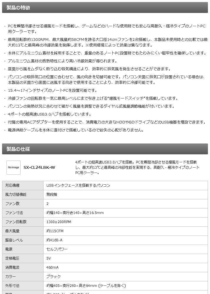 ●SX-CL24LBKと同等品です。冷却台4ポートの超高速USB3.0ハブを搭載。PCを瞬間冷却させる爆風モードを搭載し、最大約13℃と最高峰の冷却性能を実現する、高耐久・極冷タイプのノートPC用クーラー。