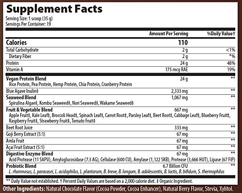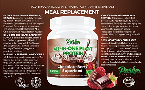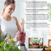 100% Natural Organic Vegetable Protein Meal Replacement. Yummy Chocolate Raspberry Flavor. Chocolate Monk Fruit Superfood with SuperGreens and Probiotics. Equal to 5-9 Servings of Fruits & Veggies