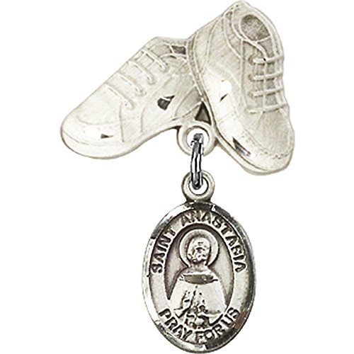 -. Title : Sterling Silver Baby Badge with St. Anastasia Charm and Baby Boots Pin 1 X 5/8 inches