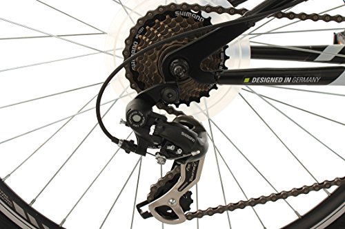 Solide Komponenten, Rahmenfederung und Federgabel sorgen für Komfort und Sicherheit. Das Mountainbike ist mit einer zuverlässigen SHIMANO 21-Gang-Kettenschaltung und mit Drehschaltgriffen ausgestattet sowie einer Beleuchtungsanlage nach StVZO. Damit macht die flotte Runde durch den Wald einfach richtig viel Spaß!