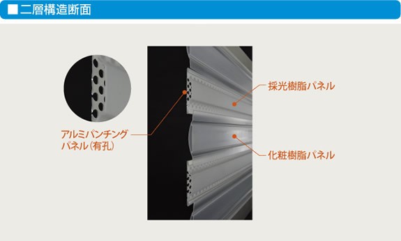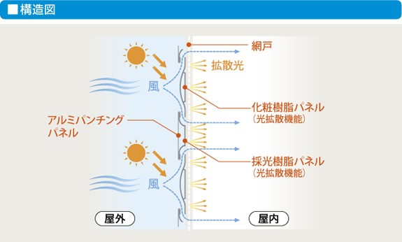アルミパンチングパネルで直射日光を遮り、パンチング孔から漏れた光は裏面の採光樹脂パネルで室内へ拡散します。設置をしても室内に暗い印象を与えず明るいイメージにします。