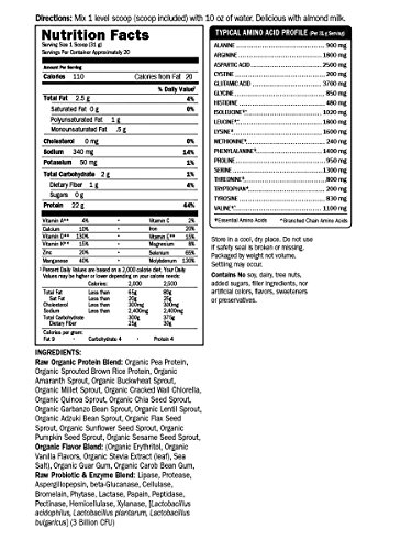-. Feature : USDA Organic, Non-GMO Project Verified, Kosher, Raw, Vegan, Gluten Free, Dairy Free, Soy Free / 22g Clean, Organic Plant Protein. Smooth & Delicious with 0g of Sugar / 3 Billion Live Probiotics & 13 Enzymes / 4g Branched Chain Amino Acids (BCAAs) / Whole Food Vitamins & Minerals, including Vitamin A, D, E & K