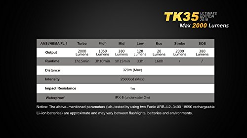 FENIX TK35 Ultimate Edition 2015 version (TK35UE) 2000 Lumen CREE XHP 50 LED Tactical Flashlight with 4 X EdisonBright CR123A Lithium batteries, Holster & Lanyard bundle