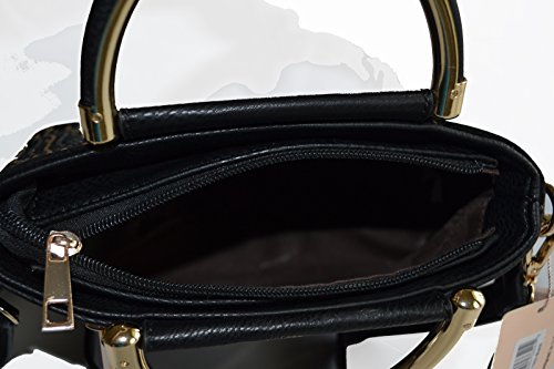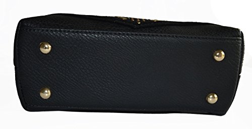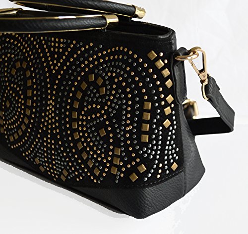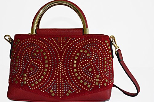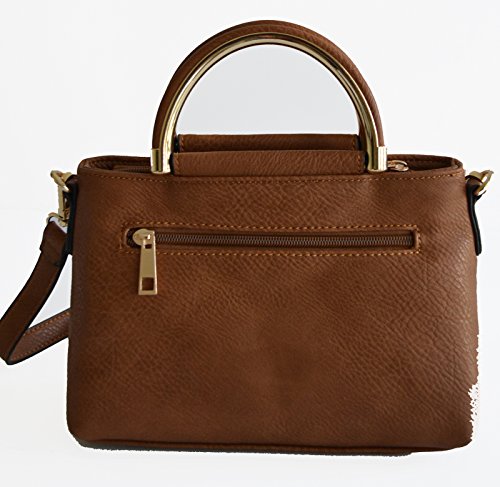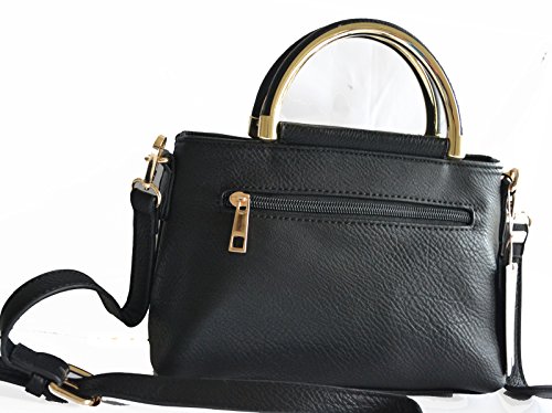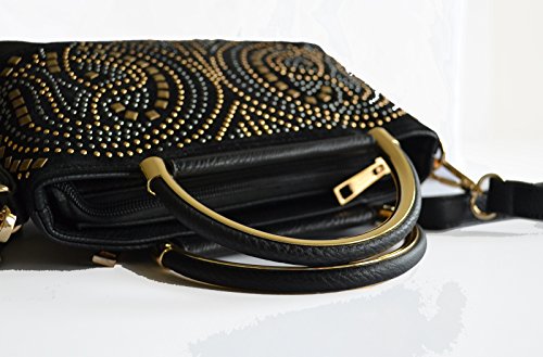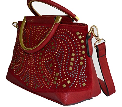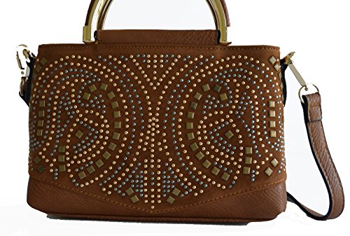 -. Feature : Pebble textured faux leather construction / Front velvet trimmed with glowing tri tone studded details, gold tone hardware / Top zipper closure, Top Handle, Back zipper closure pocket / Removable/adjustable 48" length crossbody strap, Interior wall zip pocket and 2 slip pockets / Protective metal feet, Satchel Dimensions: 9" L x 6.5" H x 3.5" W