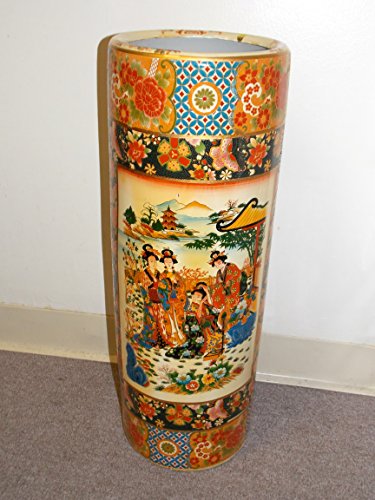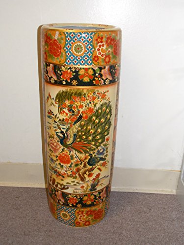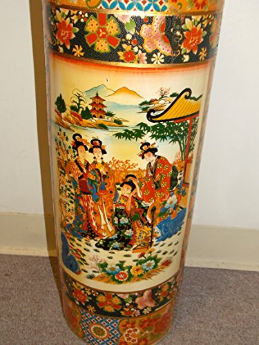 -. Feature : 24" Tall Umbrella Vase / Made out of Ceramic / Double Themed Geisha Women / Peacock Birds & Mountains