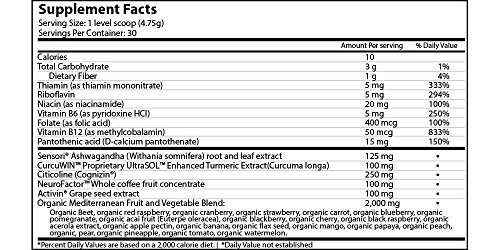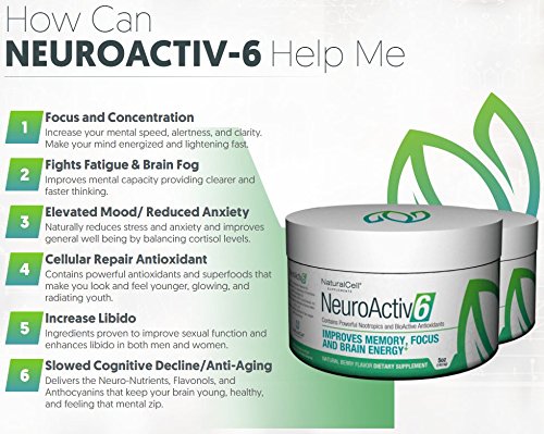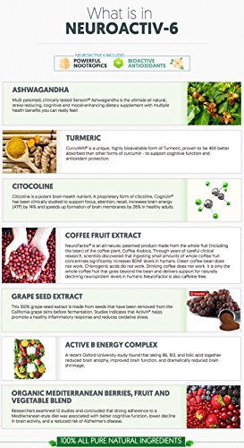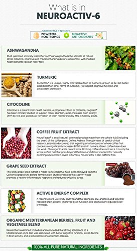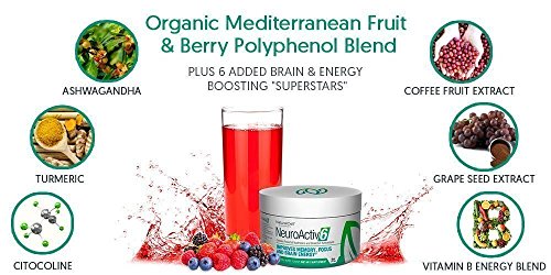 Why NeuroActiv6? Imagine putting scoops of 36 different, organic, high antioxidant, anti-aging, polyphenol packing, brain and energy boosting superfoods into a juicer, and gulping it down - how healthy would you feel? How much more energy, focus, and concentration would you have??Well, that’s exactly what you get, with one scoop of our NeuroActiv6™ Reds Superfood Powder. Need More Focus, Brain Power, or Mental Energy? Starting with an organic blend of polyphenols from antioxidant rich berries, fruits and vegetables we added 6 powerful brain-boosting nootropics?to provide a mental edge, more focus, and less anxiety. Clear Results Right Away Provides an immediate and noticeable difference with calm, focused energy and clearer thinking. Wake up motivated?and ready to tackle the day, get more done, and be in the zone Improves all markers of brain health Our trademarked ingredients have been clinically tested to show improvements in inflammation markers, BDNF levels, stress and cortisol levels. Including (1) Organic Polyphenol Blend: 2000mg of brain and heart healthy polyphenols (2) Curcuwin Turmeric: Highly bioavailable form of Turmeric, proven to be 46X better absorbed? (3) Sensoril Ashwagandha: The ultimate all natural cognitive and mood-enhancing supplement you can really feel! (4) Cognizin Citocoline:?Clinically studied to support focus, attention, recall, increases brain energy (ATP) by 14% and speeds up formation of brain membranes by 26% in healthy adults. (5) NeuroFactor Whole Coffee Fruit Extract: Significantly increases BDNF levels (6) Activin Grapeseed Extract: helps promote healthy inflammatory response and reduces oxidative stress 0 |