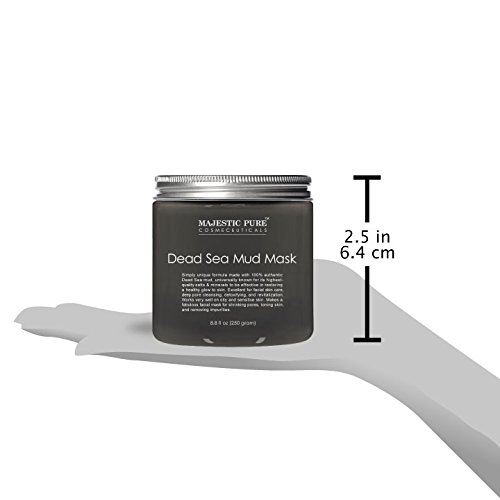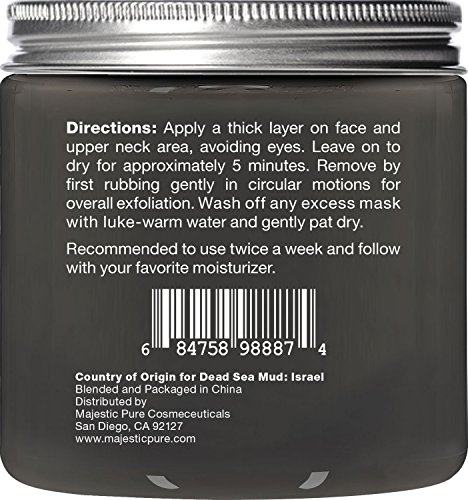 -. Feature : Dead Sea Mud Mask; Pores, Blackheads, Whiteheads, Acne and Breakouts; 100% natural formula to ensure the highest-quality product. Simply unique due to its high concentrations of salts and minerals effective in restoring a healthy rosy glow to the skin; Can be used as Blackhead Remover Mask as well as Acne Mask / Excellent for face skin care, deep pore cleansing, detoxifying and revitalization; Similar to Bentonite Clay, it makes a fabulous facial mask, for shrinking pores, tightening and toning skin, removing impurities, and just making your skin look and feel great. / SAFETY WARNING: For external use only. Rub a very small amount on the inside of your elbow area to test for any allergic reaction before use, discontinue use if irritation occurs. Avoid contact with eyes, keep out of the reach of children. Must be followed by a moisturizer after use of the product. People with sensitive skin, should not use the product. If pregnant, consult with your health care provider before use. / PREMIUM QUALITY THERAPEUTIC GRADE: Dead Sea mud is known to be effective for skin conditions, such as psoriasis and dermatitis, especially when used in conjunction with adjunct therapies, such as Dead Sea bathing, moisturizing creams, and increased sun exposure. It's also useful for relaxing sore muscles. SOOTHING SKIN: Naturally softens and moisturizes, so it dramatically improves the appearance and health of your skin leaving it more tone, even in texture, and clearer. / Why pay for expensive spa facial masks when you can get the same results at home easily for fraction of the cost? - 100% GUARANTEE - Purchase with complete peace of mind. If you are not completely satisfied with Majestic Pure Dead Sea Mud Mask Facial Cleanser Treatment, contact us within 60 days and we will refund your entire purchase.
