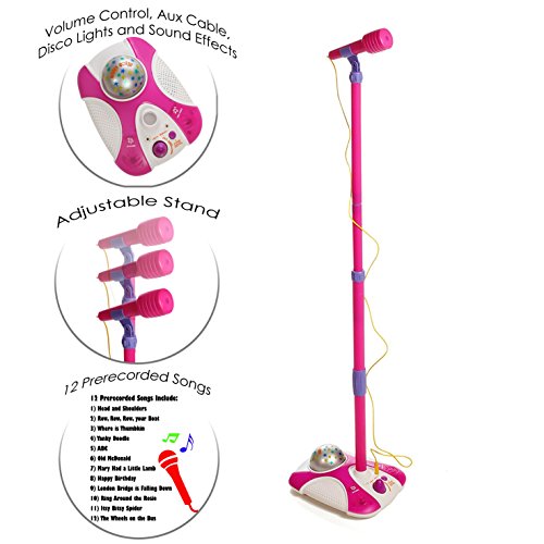 My First Disco Light Karaoke Stand Plug in & sing along with your IPOD, MP3 and CD Player!! 12 Songs Included are: