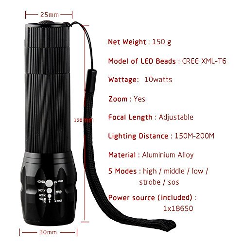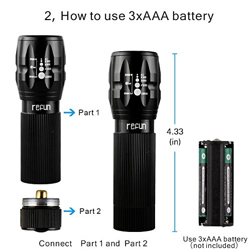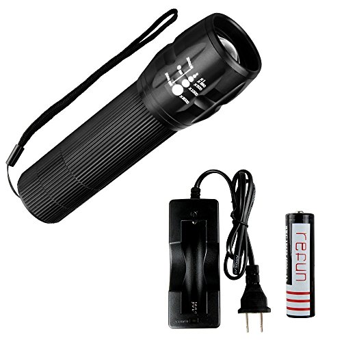 [Rechargeable 18650 Battery and Charger Included] Refun DT 900 Lumens Tactical Flashlight (Bright CREE XML T6 LED Light)Outdoor Water Resistant Torch with Adjustable Focus and 5 Light Modes
