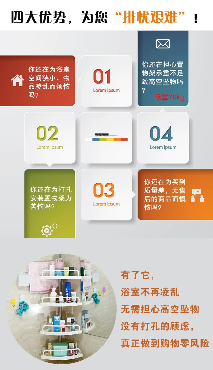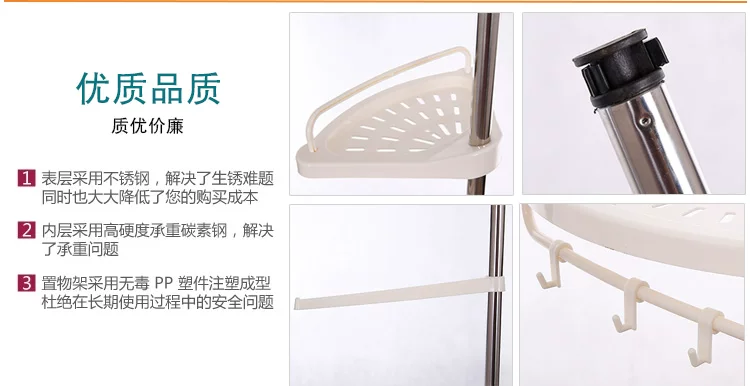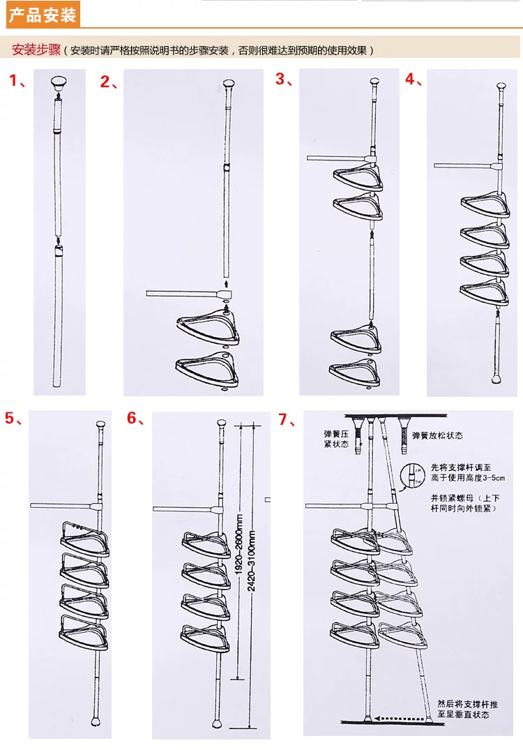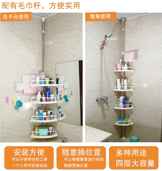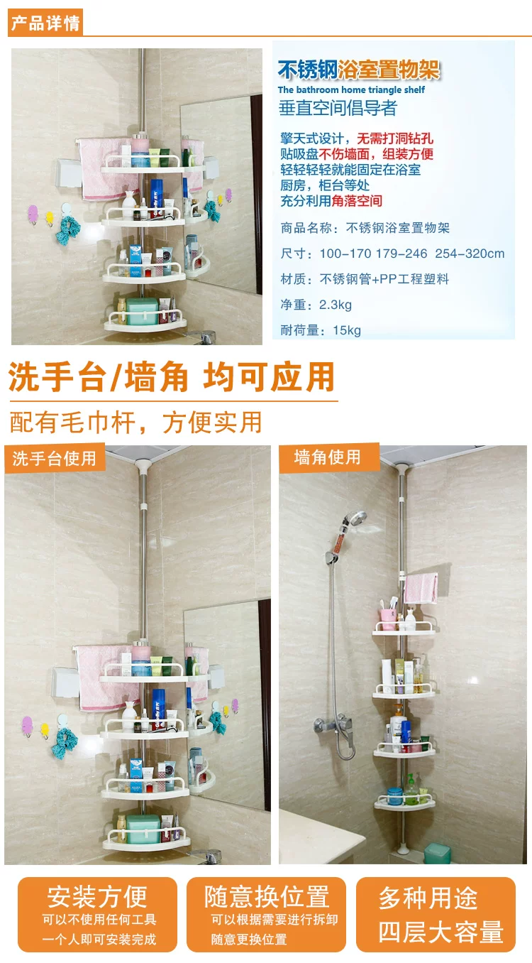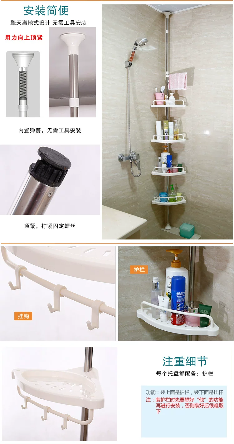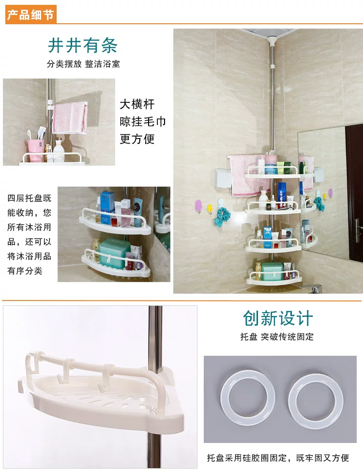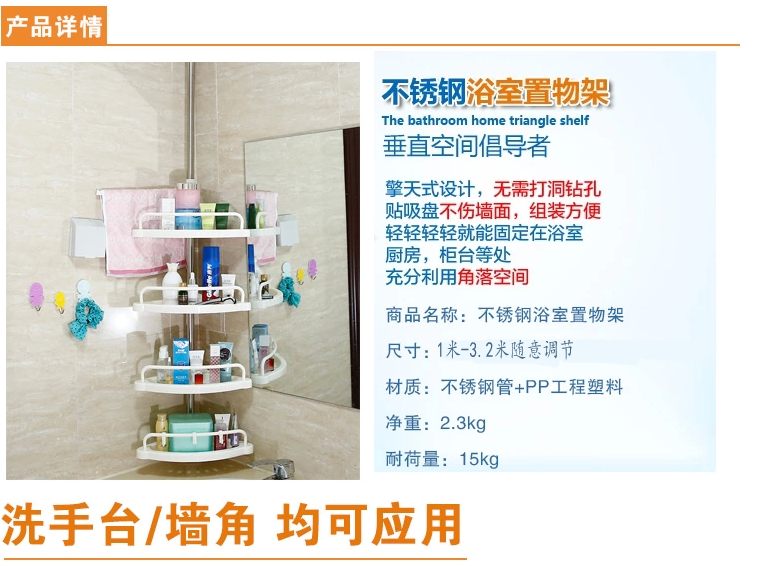 本款浴室置物架1米-3.2米随意调节高度,托盘高度随意调节。只要您的房顶能受力,都可以很稳固的安装上,一般吊顶的房子在墙角都可以使用。