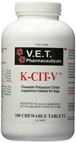 -. Binding : Misc. -. Brand : V.T.E. Inc. -. Department : Vitamins & Supplements,Internal Medications -. EAN : 0667854102337 -. Feature : Made from all natural ingredients / Reduces the chances of oxalate bladder stones / Easy to administer chewable tablets that your pet will love -. Label : Lambriar Vet -. Manufacturer : Lambriar Vet -. Model : 10233 -. MPN : 10233 -. PackageQuantity : 1 -. PartNumber : 10233 -. ProductGroup : Pet Products -. ProductTypeName : PET_SUPPLIES -. Publisher : Lambriar Vet -. Studio : Lambriar Vet -. Title : VET K-Cit-V 100 Count Chewable Potassium Citrate Tablets -. UPC : 667854102337