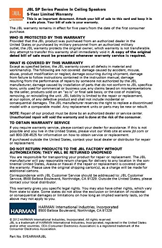 -. Binding : Electronics -. Brand : JBL -. Color : White -. EAN : 0050036922487 -. Feature : Titanium laminate tweeter for excellent high frequency sound / Rubber surrounds reduce distortion / Dog-ear brackets make it possible to retrofit / Speaker faceplates and grilles can be painted to match room decor / Optional Rough in frames are available for new construction -. IsAutographed : 0 -. IsMemorabilia : 0 -. Label : JBL -. Manufacturer : JBL -. Model : SP6CII -. MPN : SP6CII -. NumberOfItems : 2 -. PackageQuantity : 1 -. PartNumber : SP6CII -. ProductGroup : Speakers -. ProductTypeName : SPEAKERS -. Publisher : JBL -. Studio : JBL -. Title : JBL SP6CII 2-way, Round 6.5" In-Ceiling Speaker with Swivel Mount Tweeter (Pair) -. UPC : 050036922487 -. Warranty : One year parts and labor