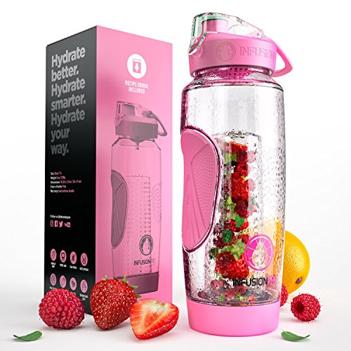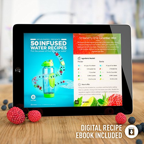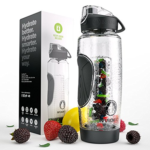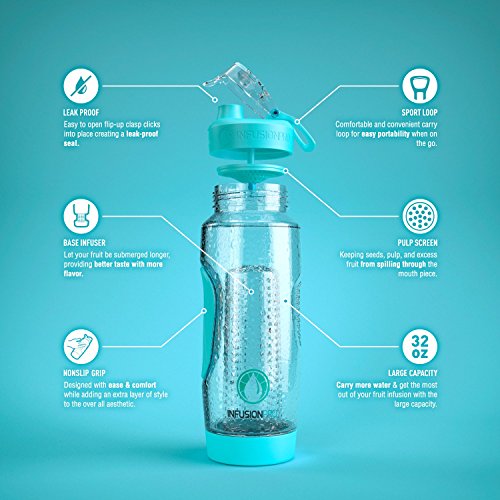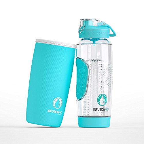 Our biggest water fruit infuser bottle size yet, this next-generation infusion bottle is innovatively designed to pack more fruity intensity into your fruit infusing water bottle. Isn't it time to enjoy water your way? Upgraded with smart new features, our jumbo Infusion Pro Fruit Infuser Bottle delivers extra fruit "zing" with every sip or chug. Not only is our fruit infusing water bottle chamber bigger than typical fusion fruit water bottle models, our fruit fusion bottle has a unique bottom-loading design that keeps your produce submerged in the water for longer, resulting in bolder, brighter flavor. Turn that boring H2O into an infinite array of tasty fruit medleys in your 32 oz infuser water bottle. •Large 32 oz water bottle capacity •Ingenious integrated strainer filters out excess pulp & seeds •Top TPR lid has soft, grippy texture •Made of tough-as-nails, BPA-free Tritan plastic •Fail-proof leak-free design •Clever flip-top cap that locks •Dual openings make washing a breeze •Top-shelf dishwasher safe •Carry handle for perfect portability •Sleek, matching neoprene insulating sleeve •For men & women, in a spectrum of fun colors •Info-packed recipes eBook included What's more, your Infusion Pro Fruit Infuser Water Bottle is supremely versatile. Take your fusion water bottle to work and stay hydrated and more focused all day. Bring it running, hiking, or cycling. Keep your flavor infuser water bottle around the house so you always have a refreshing drink at your fingertips. Register your detox fruit infuser water bottle on our website to download our fruit infuser eBook - loaded with valuable information and tips on getting the most out of your Infusion Pro bottle. This infuser bottle also makes a cool and oh-so-practical gift for your favorite fitness fanatic or someone who's trying to achieve better health.Feature